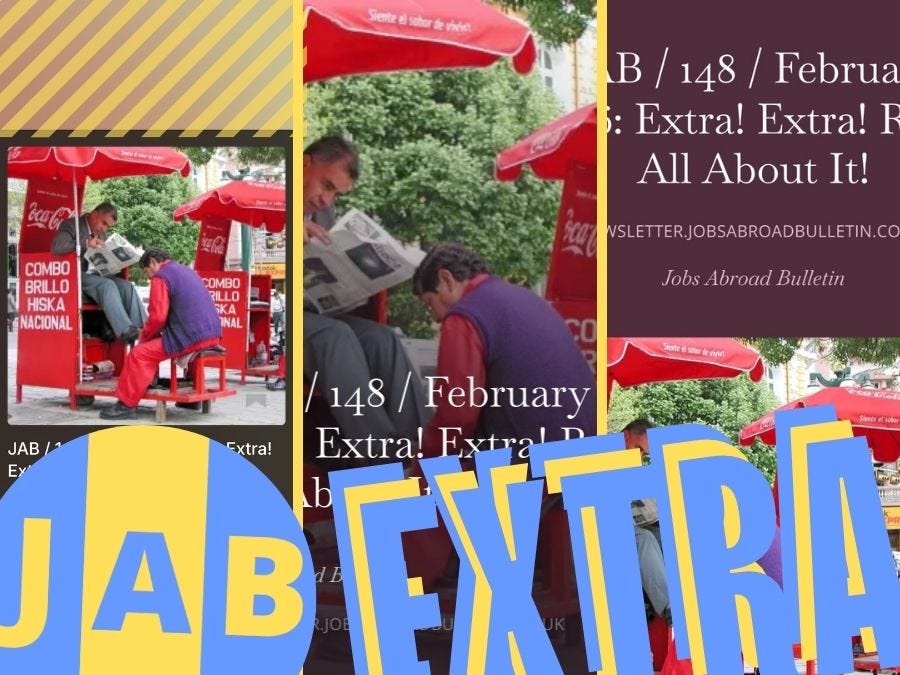 JAB is thrown together quickly on a shoestring and contains information and advertising that we believe is authentic and currently available. However, we recommend checking things out for yourselves, as we could be wrong about everything. We remind our readers that there are many scams on the internet aimed at people looking for work abroad, and suggest reading our Warnings, Safety and Spotting Scams pages.